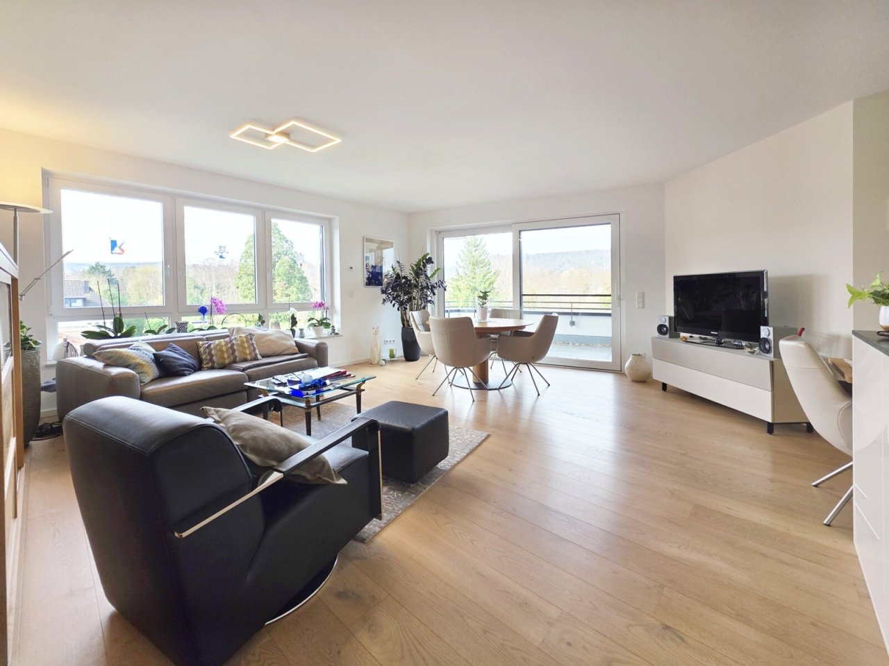 Herzstück der Wohnung ist der offen gestaltete Wohn-, Ess- und Küchenbereich, welcher durch seine Großzügigkeit und Helligkeit besticht. Von hier aus gelangen Sie direkt auf die sonnige Terrasse mit herrlichem Blick ins Grüne – ein perfekter Ort zum Entspannen und Genießen.…